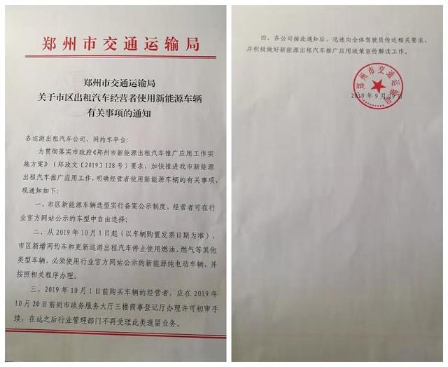 记者从郑州市交通运输直属单位——郑州市城市公共交通客运管理处网站获悉,9月29日,郑州市交通局发布《关于市区出租汽车经营者使用新能源车辆有关事项的通知》(以下简称《通知》) 。要求自2019年10月1日起,郑州市新增网约车、更新巡游出租车停止使用燃油、燃气等其他车型,必须使用官网公告的新能源纯电动汽车。 .
